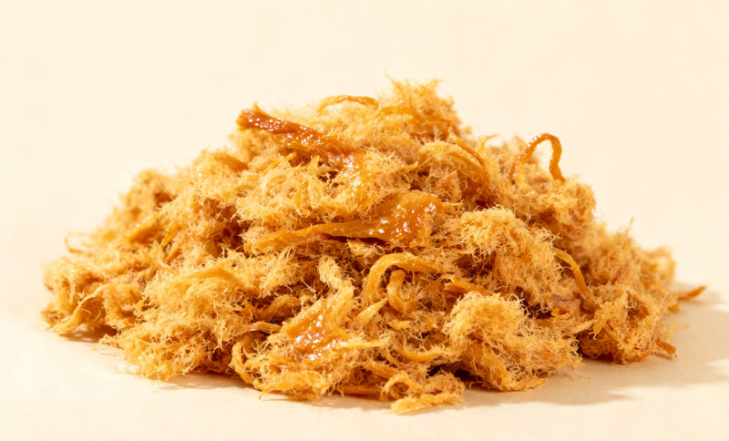 肉松一般经过:煮熟鸡肉 → 拉丝 → 烘焙 → 分选 → 包装出厂