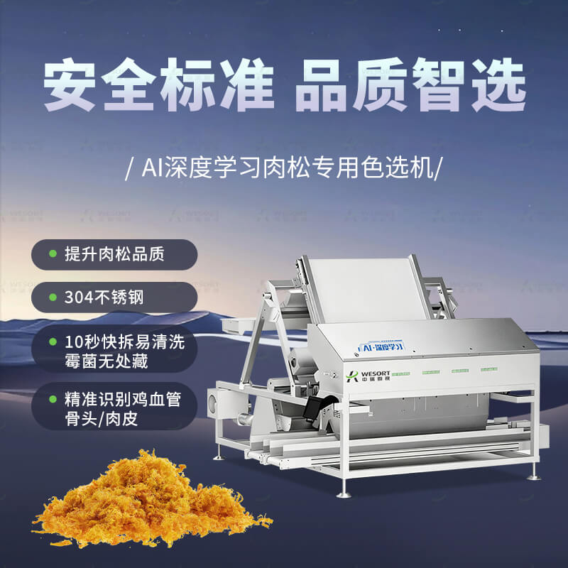 以中瑞微视(WESORT)为代表的新一代肉松专用色选机,通过AI深度学习系统与高精度视觉识别技术,能在毫秒级内识别并剔除各种杂质,真正实现“肉松更干净、分选更稳定”。